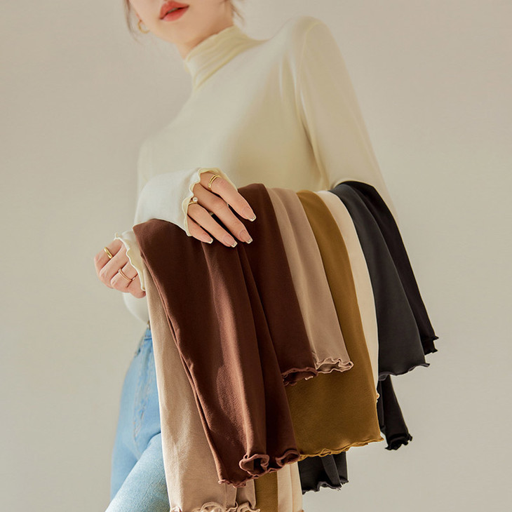 文案:万能打底衫闭眼入✌️ 版型贴合但也不紧绷~木耳边设计单穿或搭配毛呢大衣、羽绒服,随性时髦~