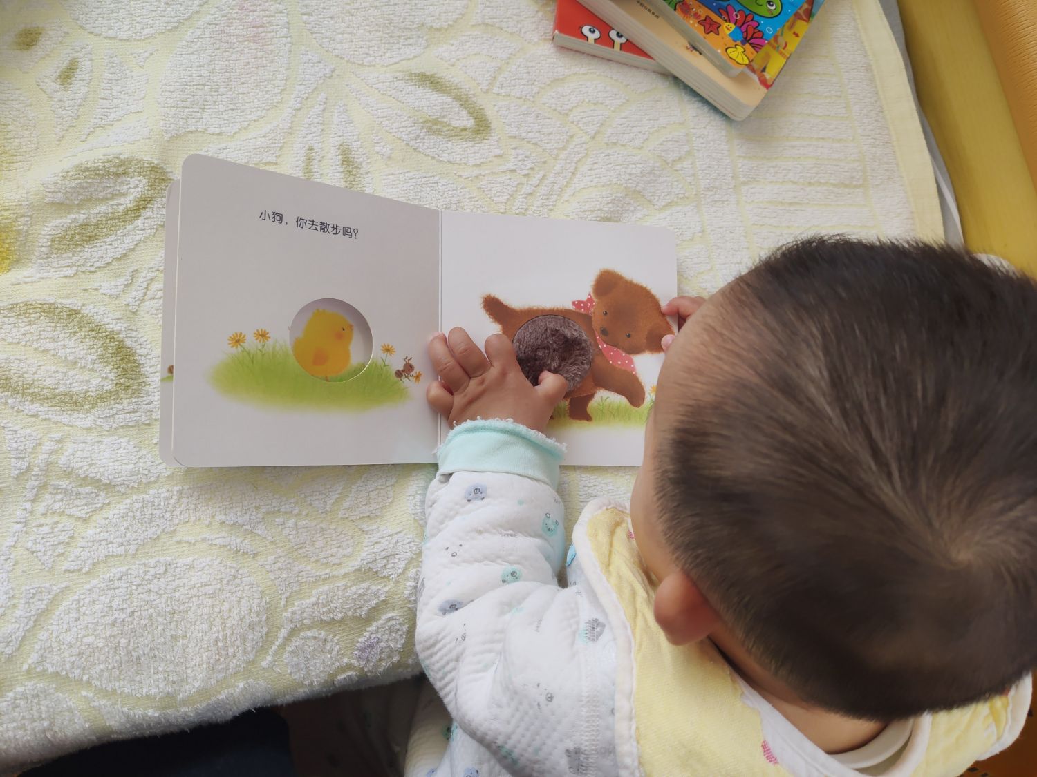 现在宝宝已经能站着自己翻书看了,宝宝很喜欢去触摸小狗肚子上的绒毛。