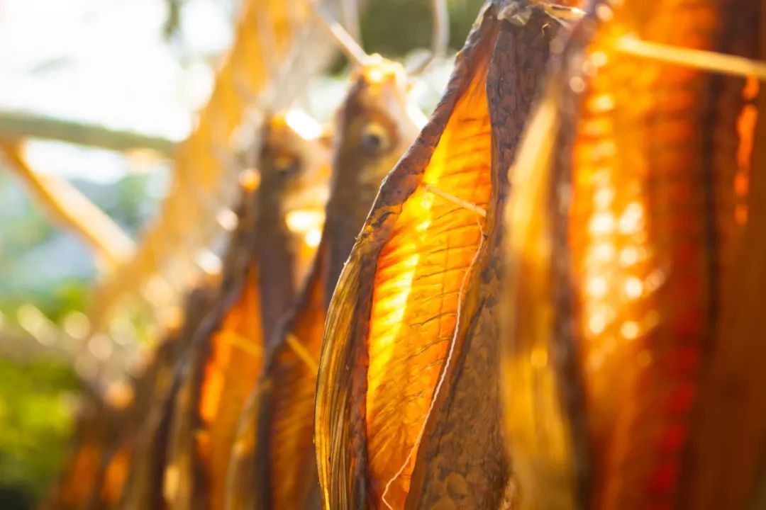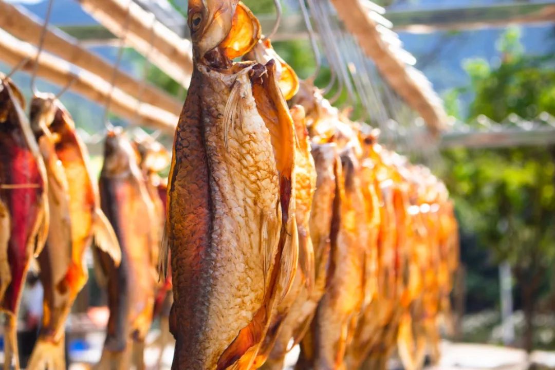 迎着太阳,金灿灿的腊鱼色泽饱满