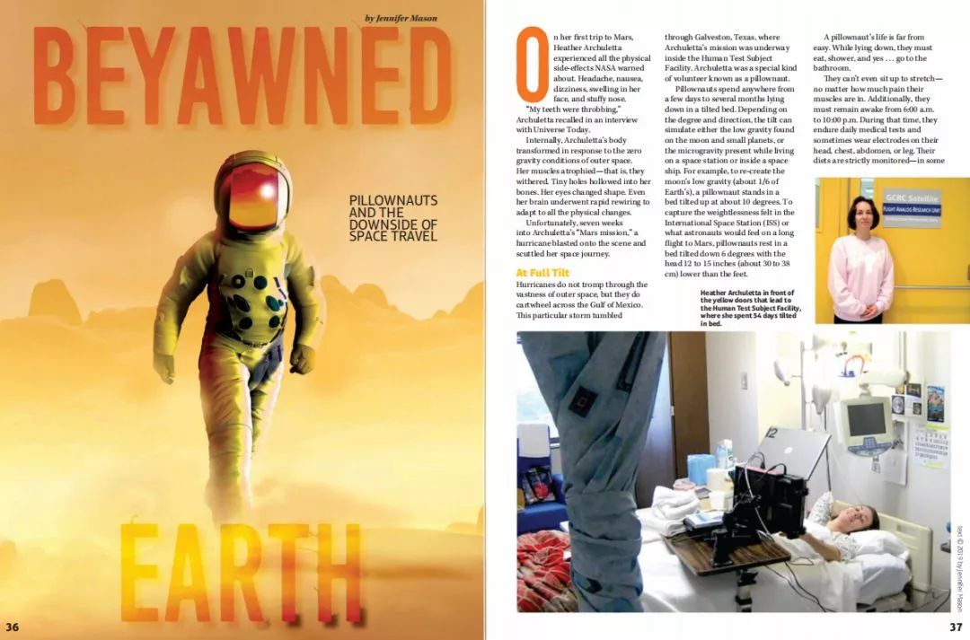 在《好奇号》创刊号中有篇文章,标题直译过来是《超越地球》,副标题直译过来是“枕头和太空旅行的负面影响”,画面是个走路的太空人,是不是一时间摸不着头脑:这篇文章是讲什么的?