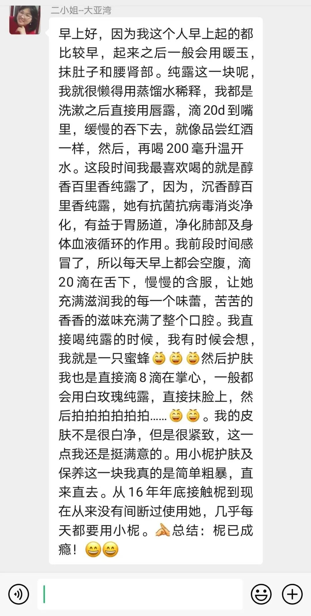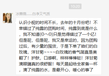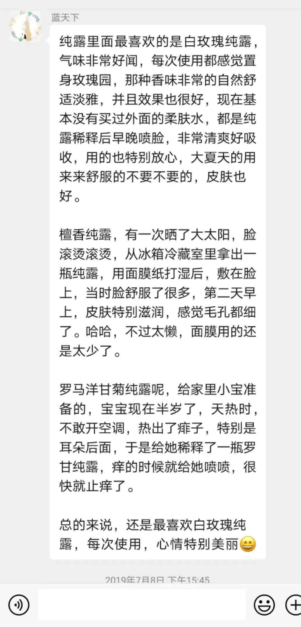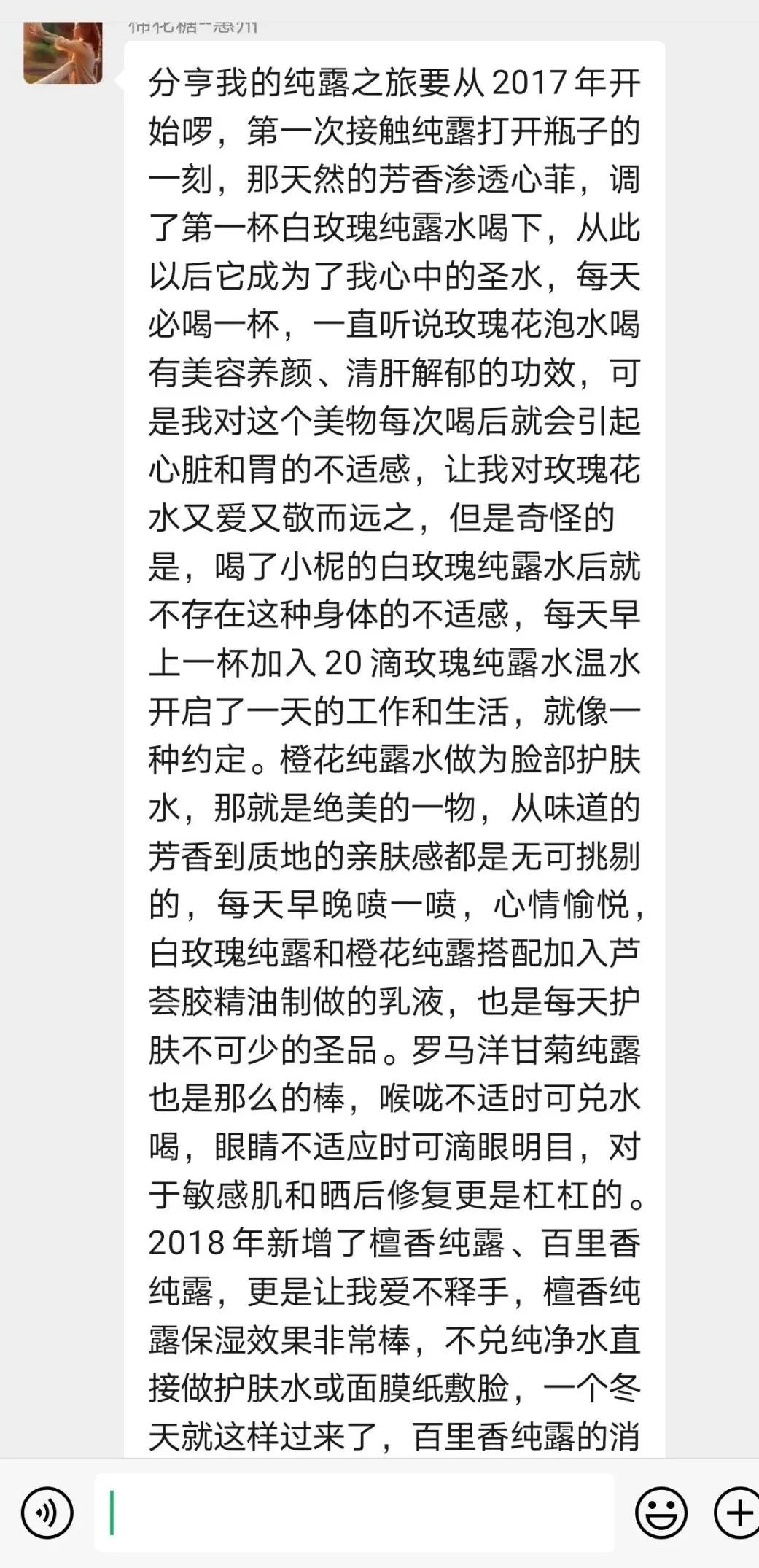 整体上来说是一款不可多得非常棒的护肤纯露,对油腻、痘痘、痤疮性皮肤非常适合,可以跟白玫瑰、檀香、橙花等搭配,敏感性皮肤使用的时候,需要注意稀释蒸馏水后再用,或者做敏感测试。