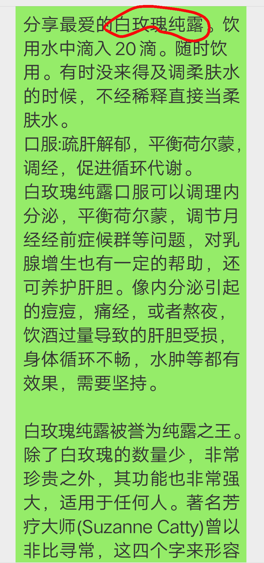 高兰博士曾说过,白玫瑰无论是精油或纯露,功效都比大马士革更胜一筹,气味更亲切优雅抚人心慰!气味无法以被描述,用过就就理解了。
