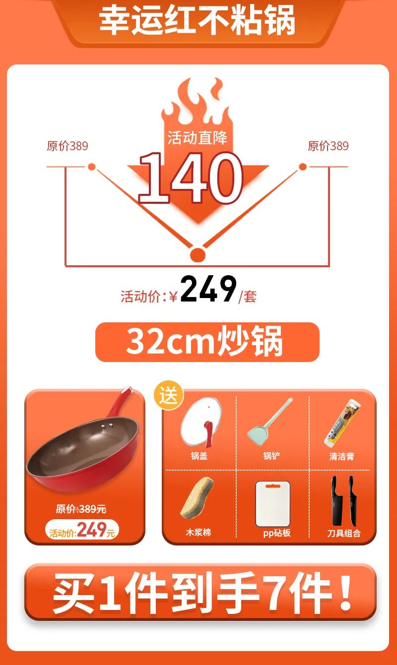 而这口幸运红炒锅,经过向品牌方的再三争取,给大家带来了一个非常非常良心的价格:直降140元,到手价249元。