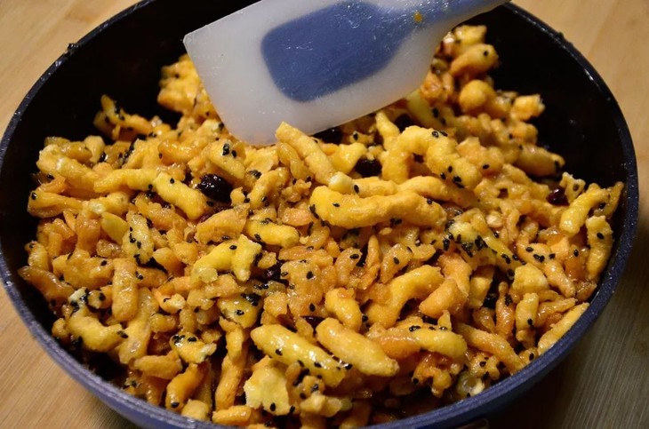 3、把炸好的小条放入糖浆里拌匀,撒些黑、白芝麻(根据自己喜好放入干果);