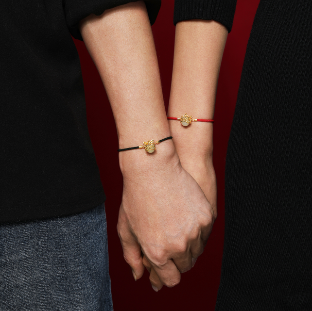 可以女生戴红绳,男生戴黑绳,组成情侣款,加上定制字母,就是一份两个人的专属信物,幸福美满。