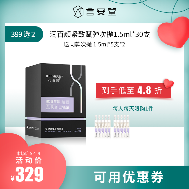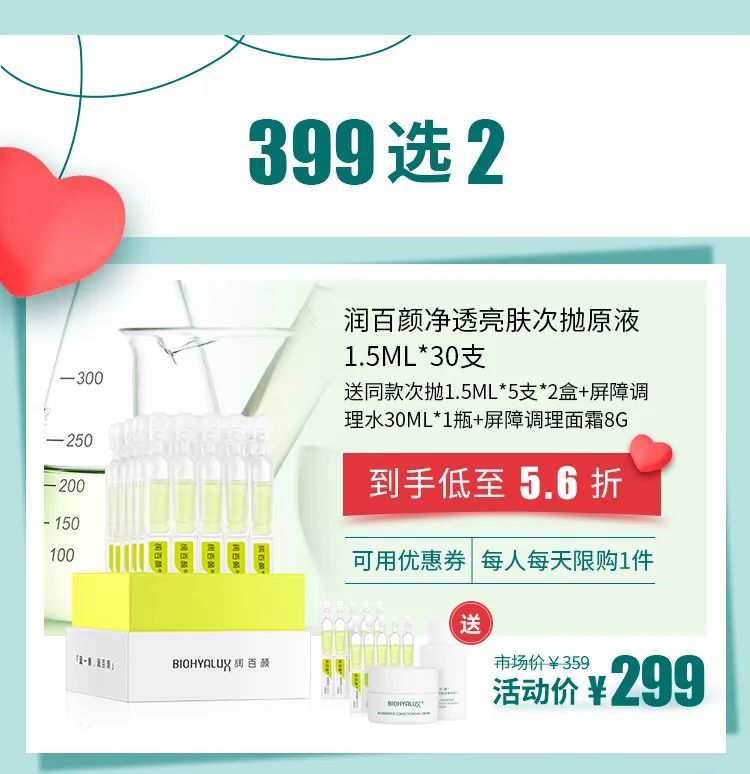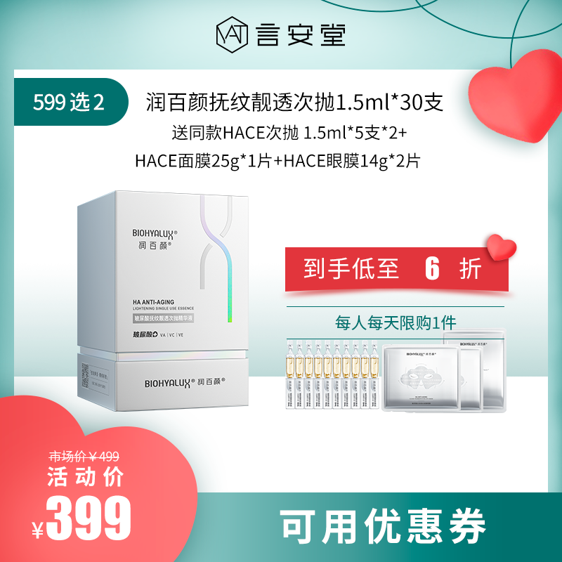 ⚠️润百颜抚纹靓透次抛精华液1.5ml*30支装,堂里七夕活动价399元,送同款HACE次抛 1.5ml*5支*2+ HACE面膜25g*1片+HACE眼膜14g*2片!同步参与店铺七夕活动599元任选2件,搭配专区其他产品一起购买,到手价低至4.4折!再领七夕活动满减券,到手价更优!