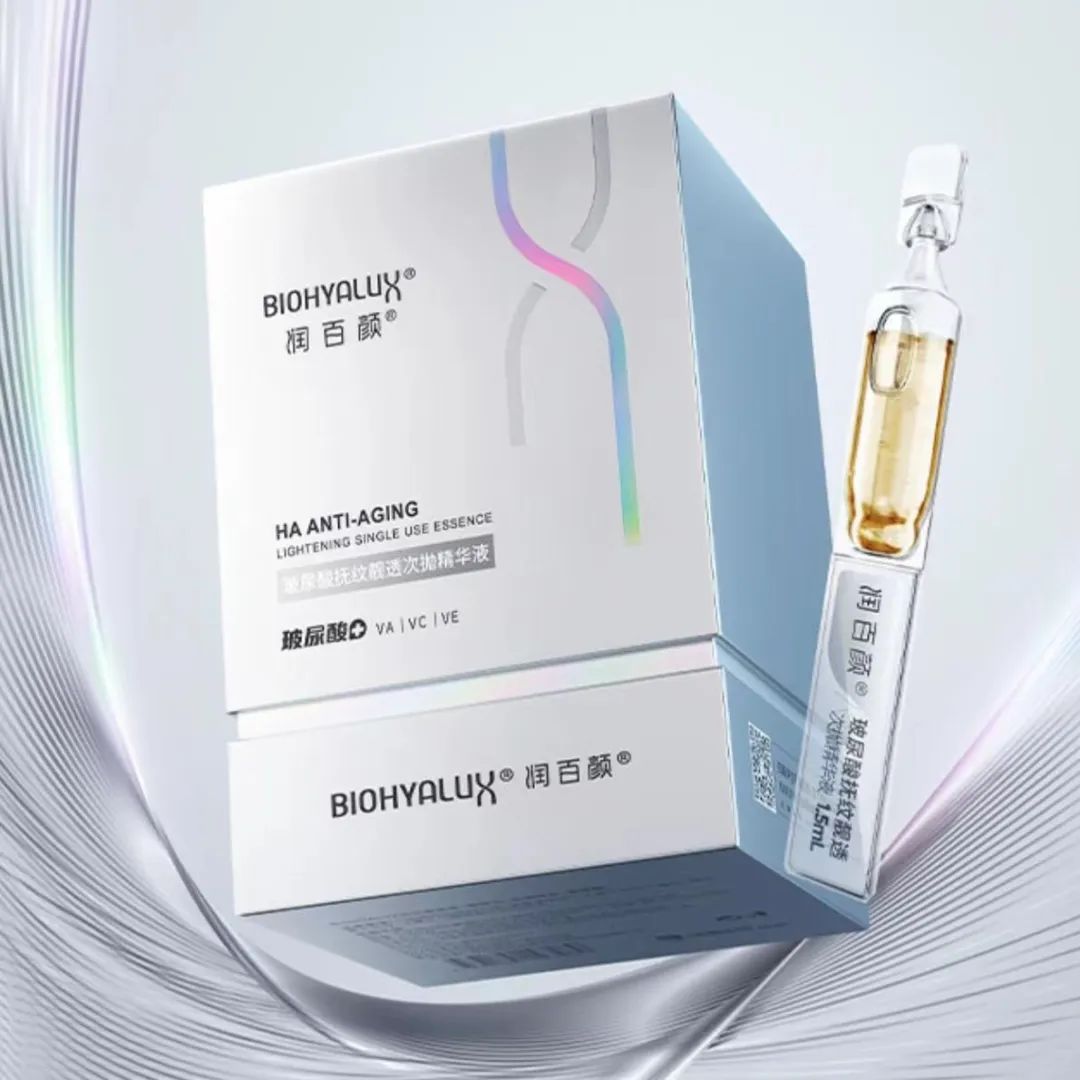 新产品润百颜玻尿酸抚纹靓透次抛精华液,运用微囊包裹技术把当下火热的维生素活性护肤成分都囊括在了配置当中。