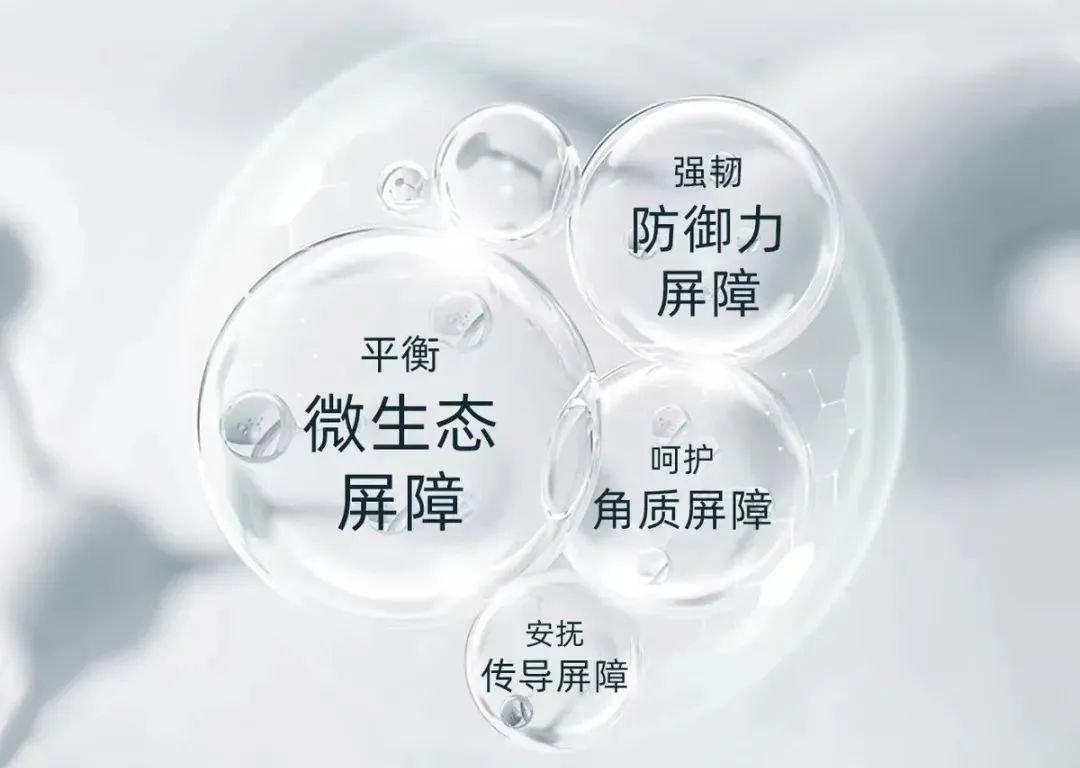 神经酰胺组合+植物鞘氨醇+胆甾醇为肌肤补充脂质,配合不同分子量的透明质酸,修护角质屏障;乳酸杆菌发酵溶胞产物改善肌肤微生态屏障;