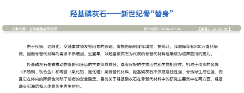 HAP是人体骨牙的主要成分,人体骨骼的65%、牙釉质的95%都是HAP,总含量达到人体的20%。HAP也是易于消化的磷酸钙的丰富来源,并被用作饮食补充剂和食品添加剂。