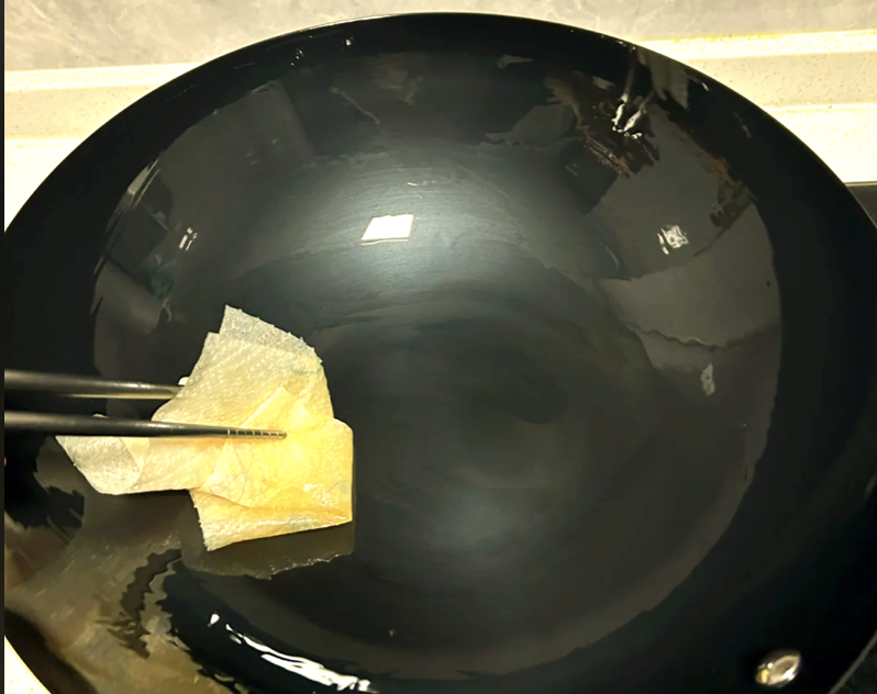 抹油是升华: 烘干后,趁锅还有余热,用厨房纸蘸取一两滴食用油,在锅内壁薄薄地涂抹一层。这叫“上油保养”,能不断巩固和加强油膜。