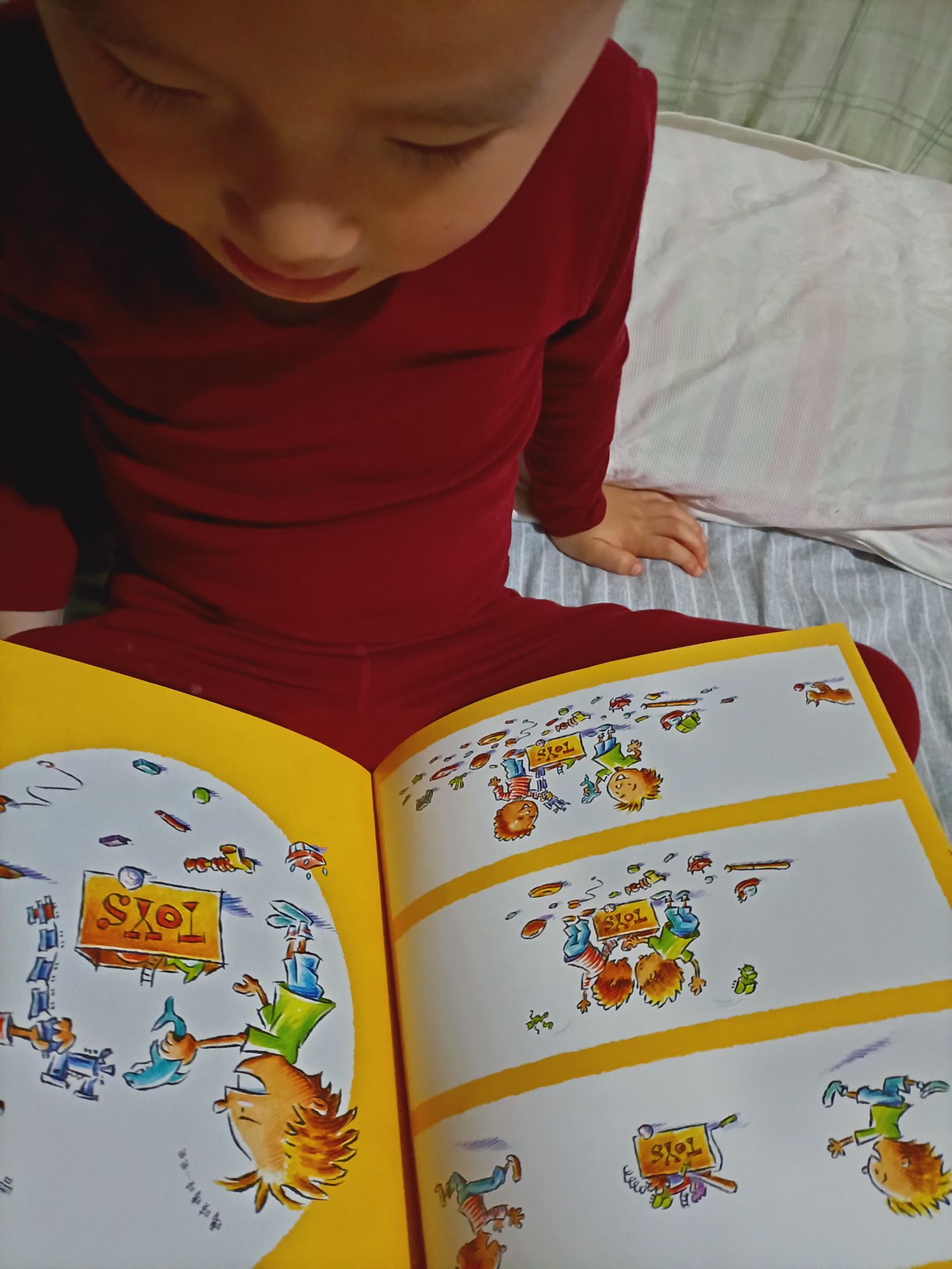 翻开书才知道是两个男孩挑选了他们最喜欢的玩具鲨鱼和火车在假装决斗,两个男孩子之间玩玩具,非常童趣可爱,贴近孩子们生活。