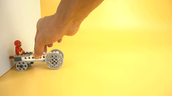 摇动把手后,小赛车就会在橡皮筋和齿轮的带动下,向前行驶啦。先来个慢镜头感受下: