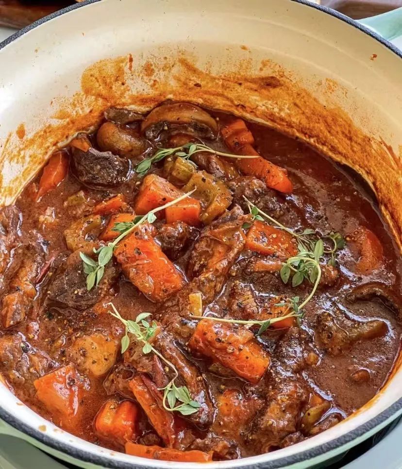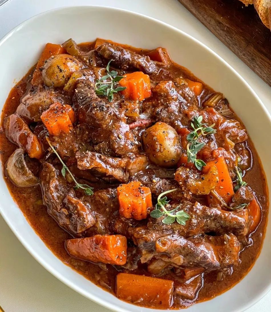 6.铸铁锅密封好,能更好的保留食物的营养,炖好的牛肋条包裹着带有红酒甘醇的浓郁酱汁,每一口都是嫩滑香浓的口感,用来配米饭或面包都是极好的!