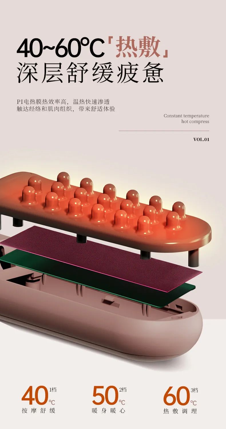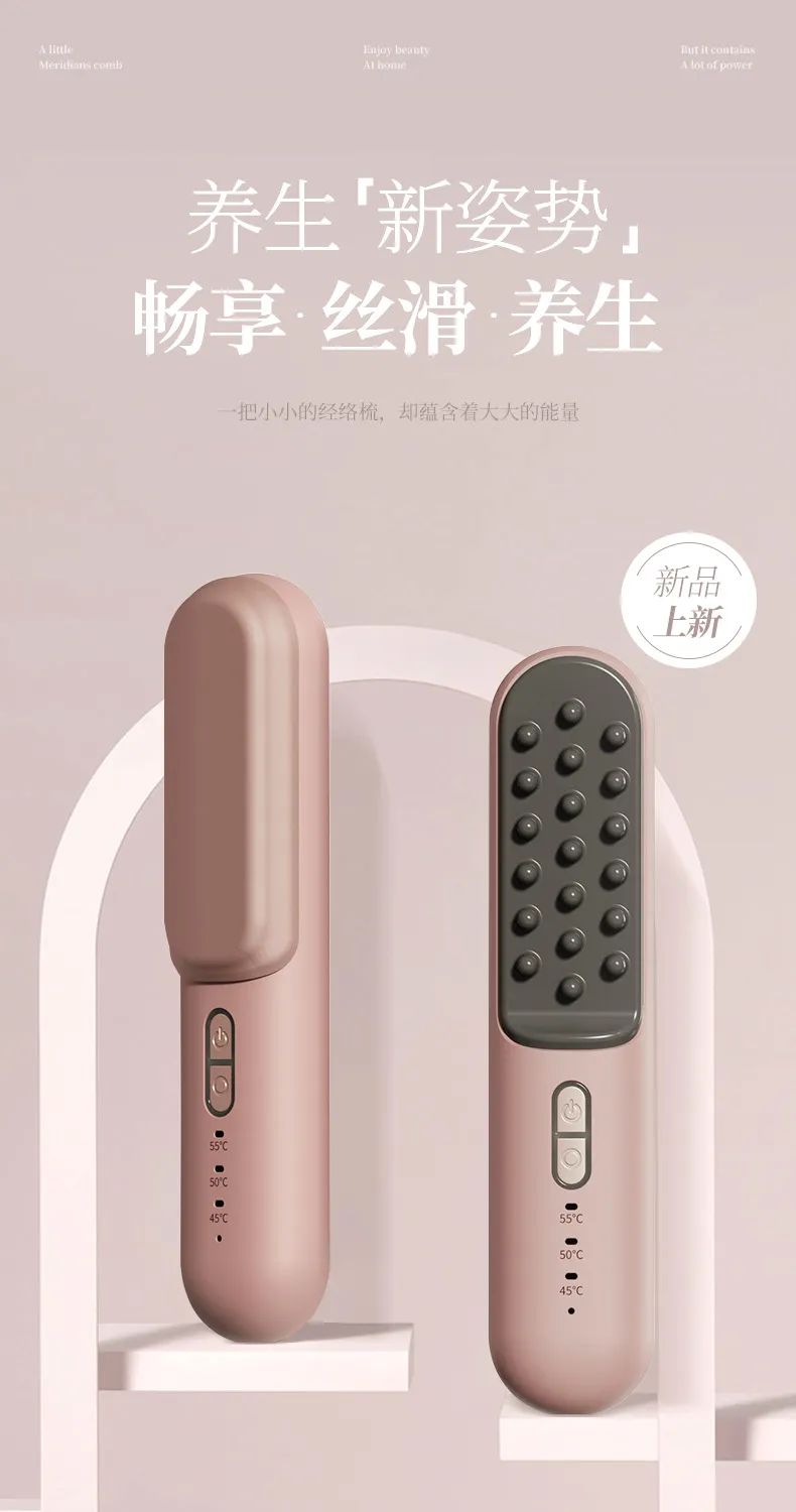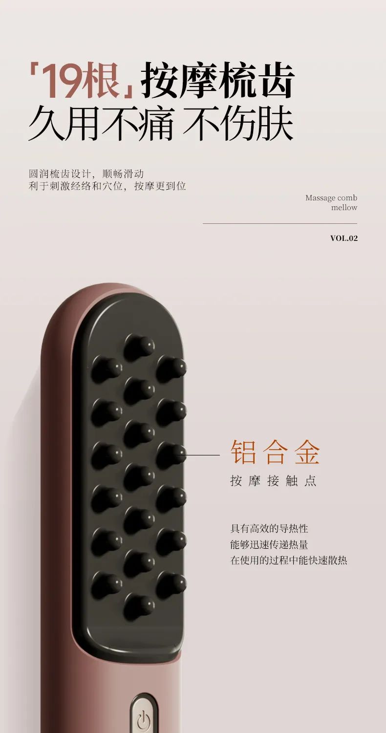 在传统按摩梳的基础上进行了精妙的外形结构改动。考虑安全性和使用性采用了独特的 19 个球型按摩梳齿设计,这些球型梳齿能更加贴合人体肌肤的曲线,机身采用直发梳机身设计,符合人体工程学原理,握感舒适,操作便捷。有三个温度调节40°~60°可以根据皮肤接受程度使用,无论是头部的各个穴位,还是身体其他经络部位,都能精准触及,深度疏通经络。