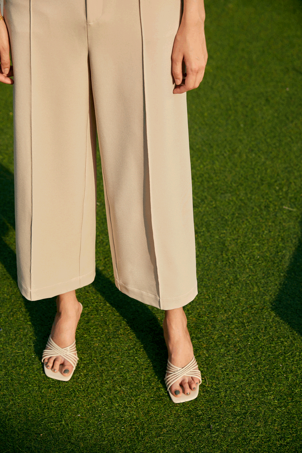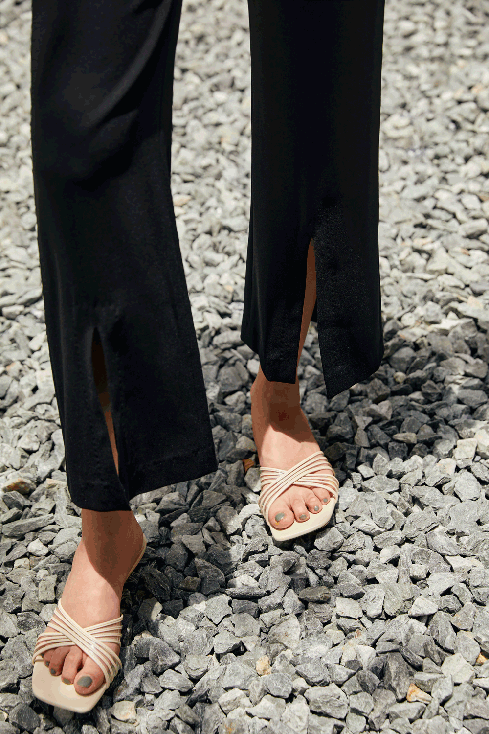 同样返场的黑色开衩微喇裤,面料全线升级。