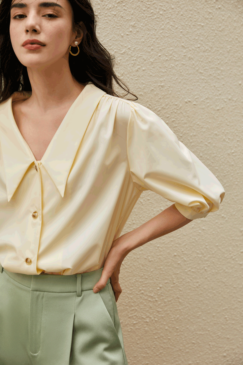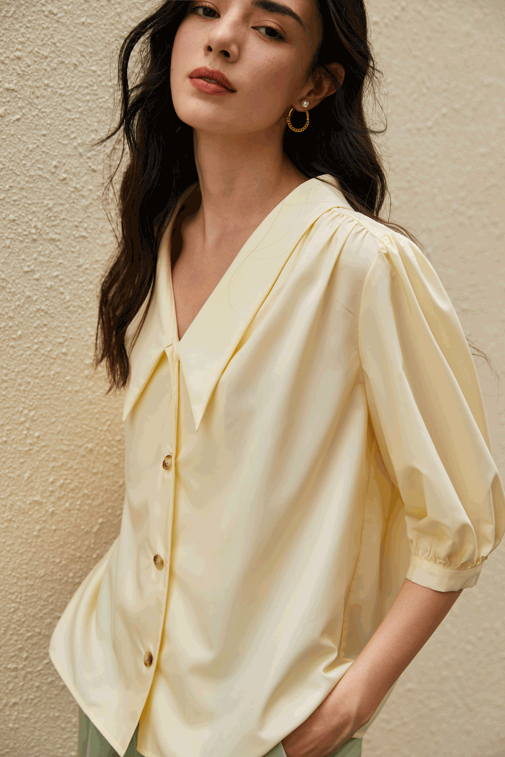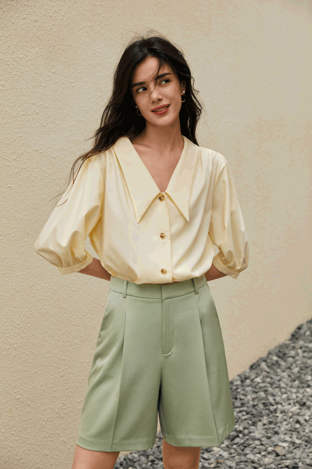 娃娃领和泡泡袖增添俏皮感,轻松减龄。