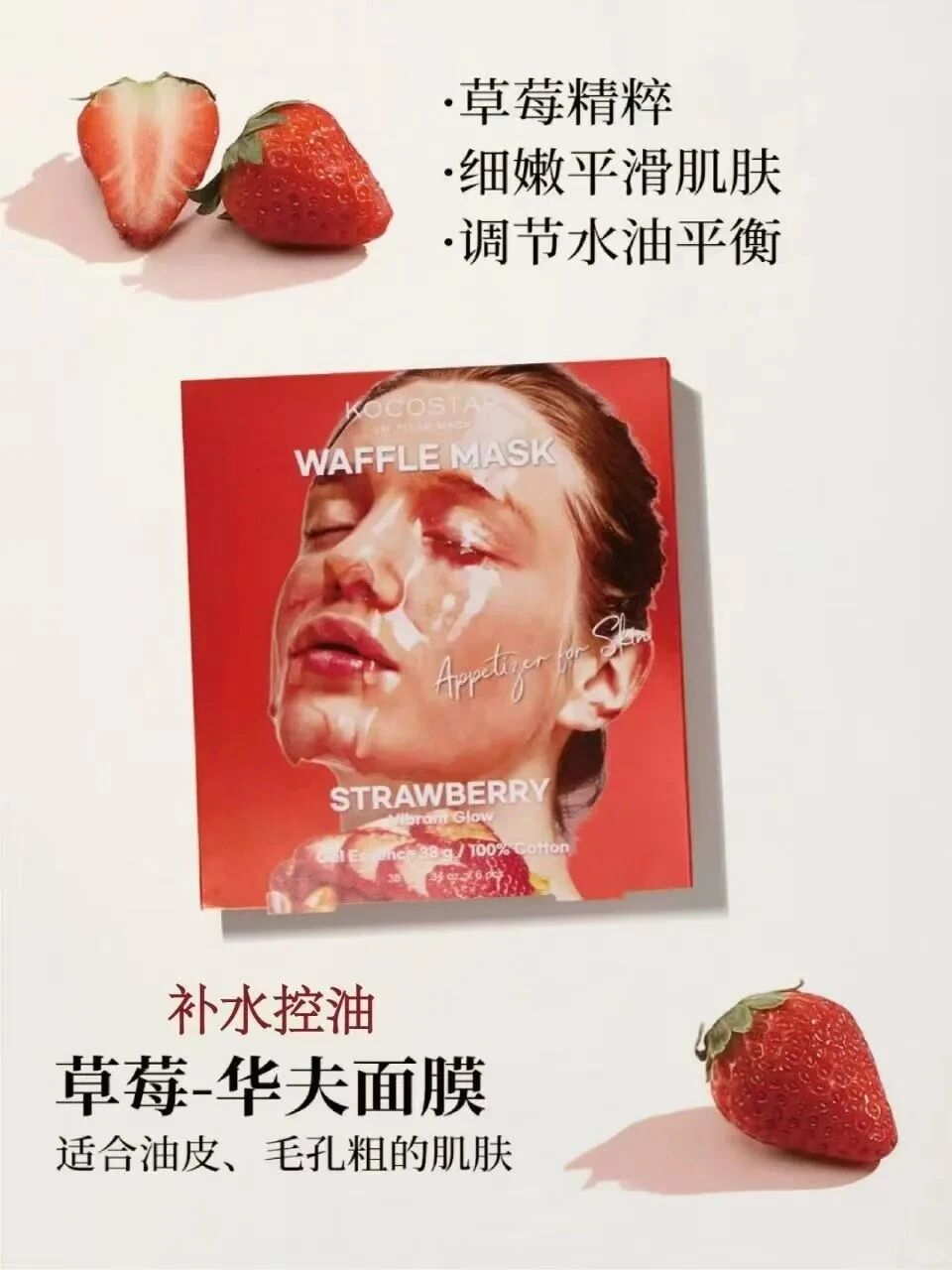 草莓提取物配合华夫膜布,主打细致嫩肤。淡淡的草莓香,敷起来很有少女感,适合需要提亮肤色、细腻毛孔的人。