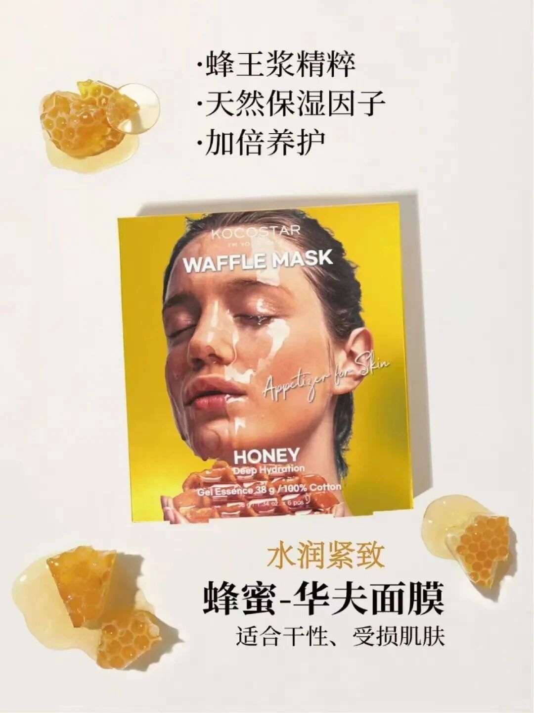 🍯 可可星 蜂蜜华夫面膜 38g*6注入天然蜂蜜提取物,可深层滋润和滋养肌肤。主打保湿滋养,适合干性肌肤,敷感温和舒适。