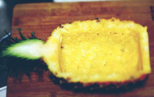 1、菠萝外皮清洗一下,顺着切开,横竖划几刀,取出果肉,改成黄豆粒大小的丁,用淡盐水浸泡5分钟,沥干水分备用,菠萝壳备用;