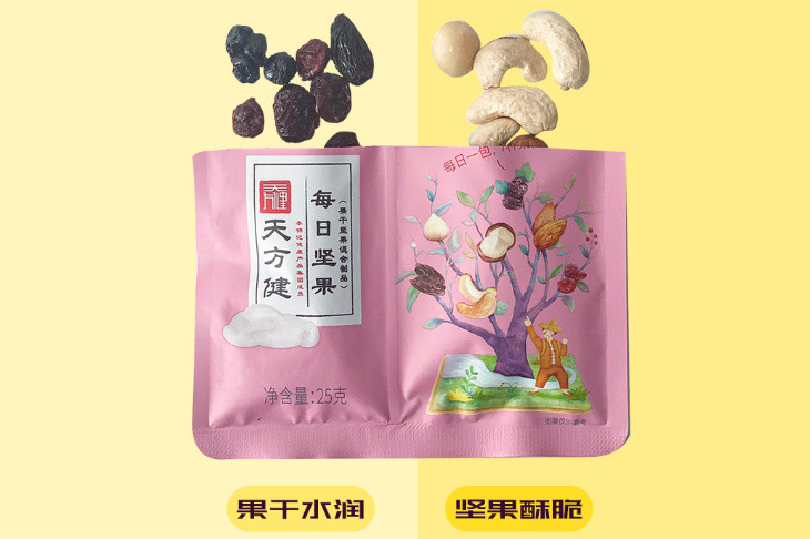 天方健「每日坚果」,选用干湿分离「锁鲜」包装,将“干果”与“软果”分隔开,既保留了扁桃仁、腰果仁、榛子仁、夏威夷果仁的酥脆干果风味,也让蓝莓干、蔓越莓干、葡萄干的软糯香甜口感得到全“鲜”保留,喜欢吃啥,就吃啥!