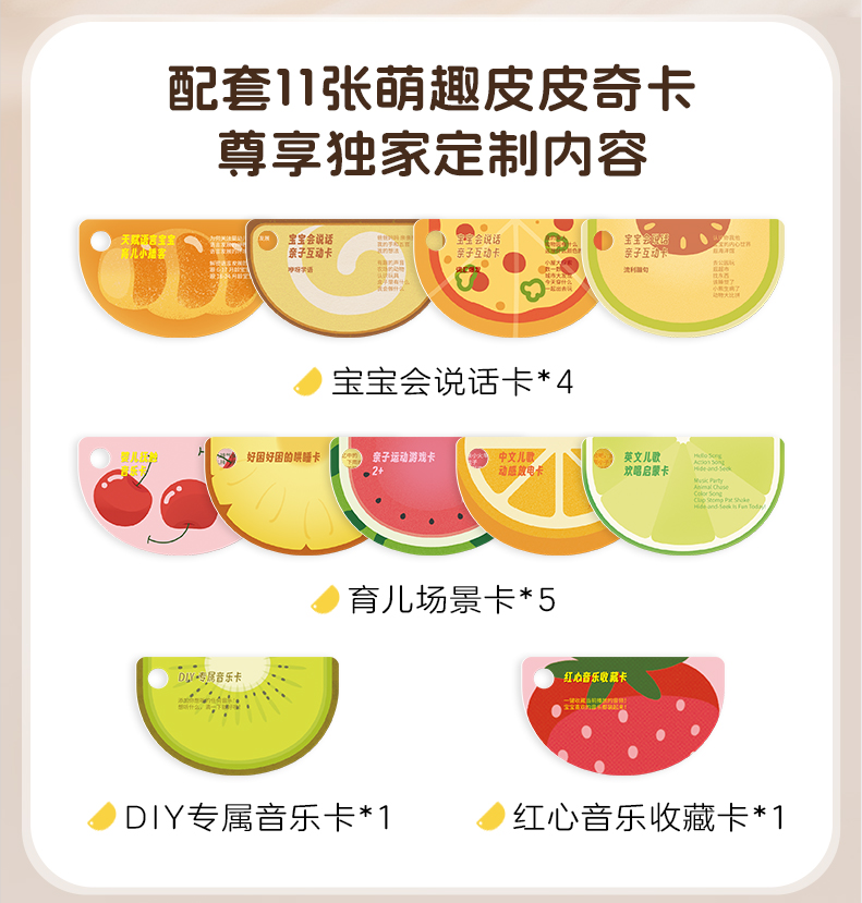综上,11张萌趣皮皮奇NFC卡,包括不限于25节语言亲子早教课+全套新生儿抚触课程+亲子运动游戏课+哄睡电台,妈妈还可以自由DIY,每个都惊喜满满!
