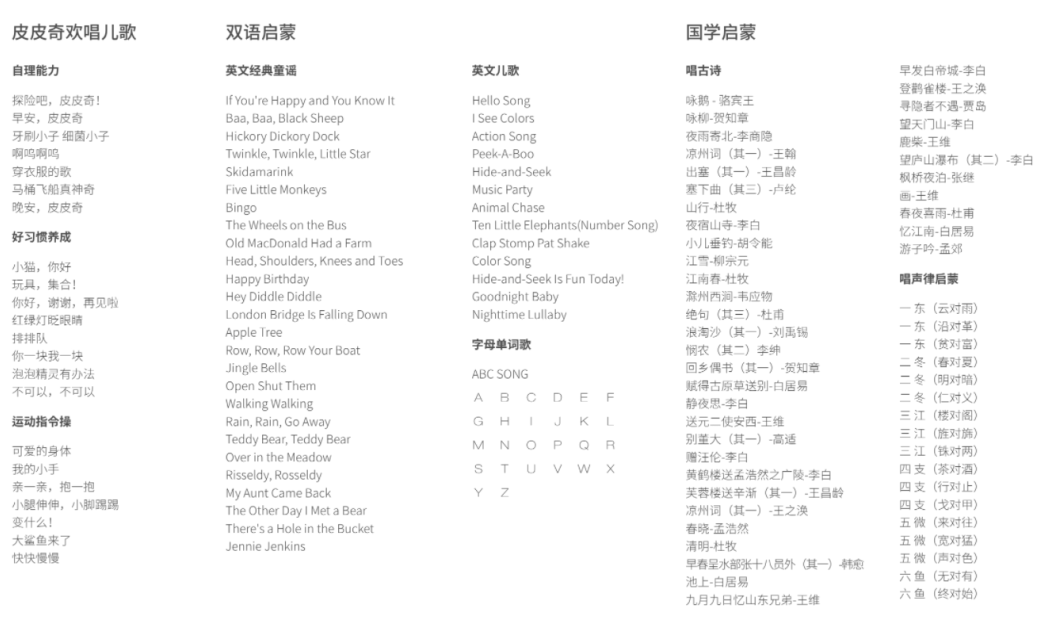 除了我们的皮皮奇卡内容外,机器里还内置了1000 + 分钟独家熏听内容——不用额外找资源,开机就能听;短按目录键可以切换一级目录、长按切换二级目录、左侧摇杆切换上/下一首,自由选择想听的内容哦~
