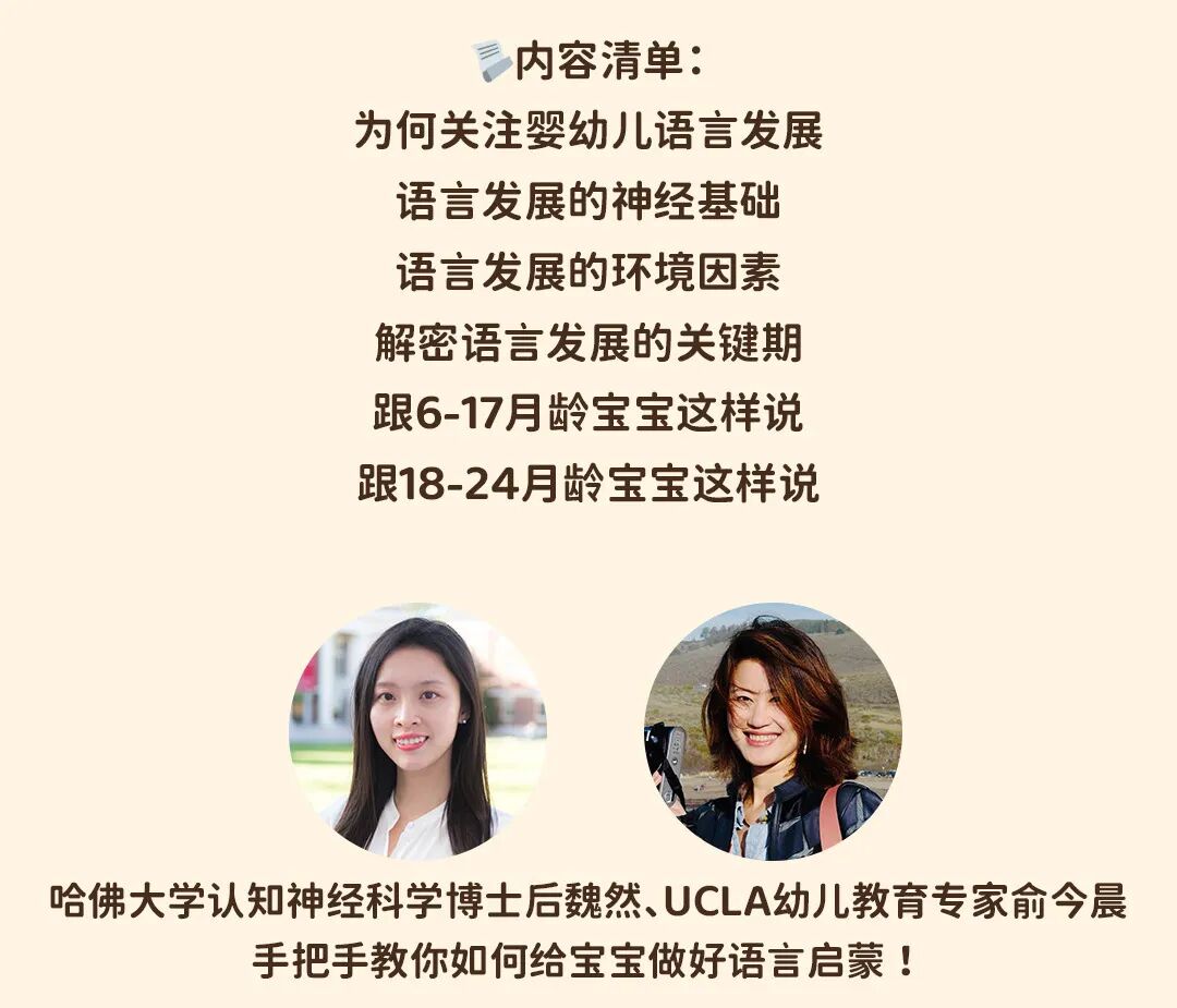 这是实打实的给家长的育儿干货,是哈佛大学认知神经科学博士后魏然、UCLA幼儿教育专家俞今晨亲自为你讲解0-3岁语言黄金期的奥秘。