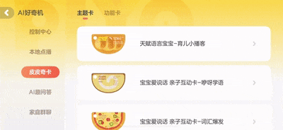 独创NFC滴卡互动设计,像玩游戏一样,拿着卡片往皮皮奇的小脸上“滴”一下,听到萌萌的“啊呜啊呜”一声后,想听的内容立马播放啦~