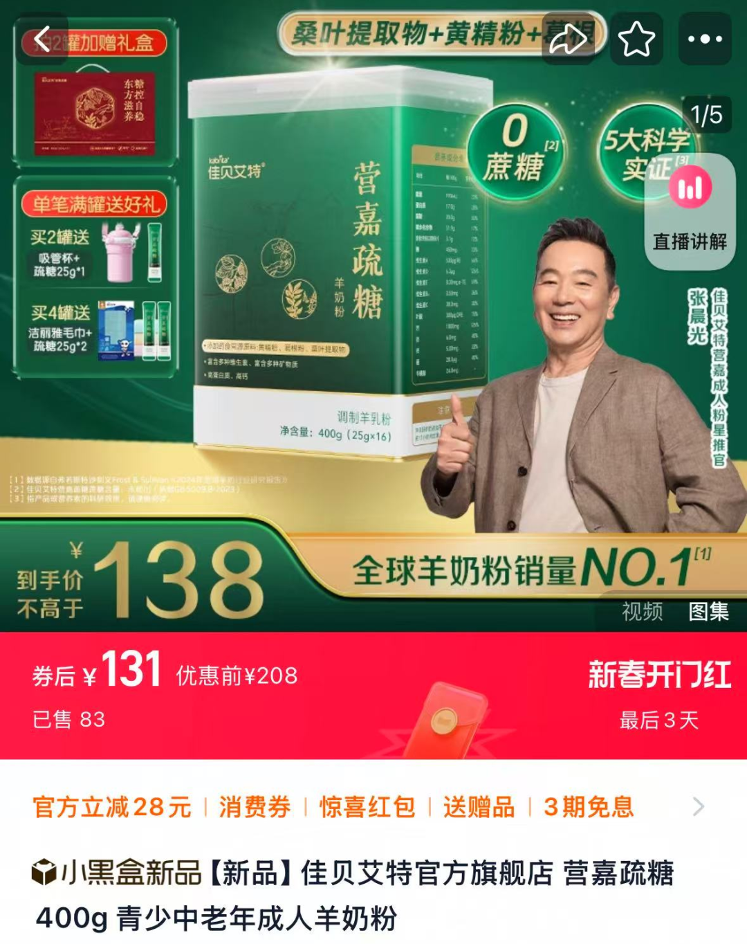 佳贝艾特疏糖羊奶粉一罐400克。日常价:139元/罐,春季活动价:129元/罐!