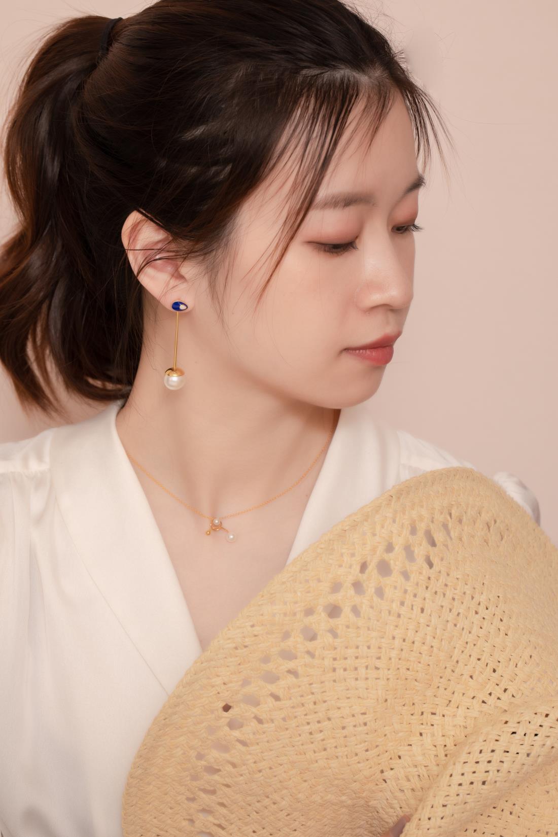 扎起头发,耳环刚好可以自由地摆动,典雅又不失可爱~耳环上的贝珠晶莹透亮,很显质感与别致的同时也修饰了脸部线条~