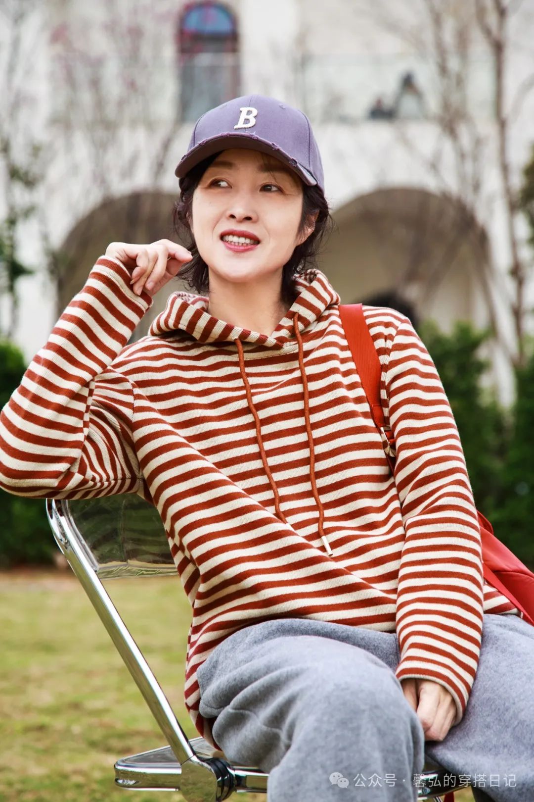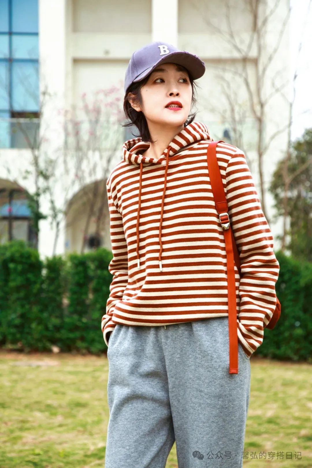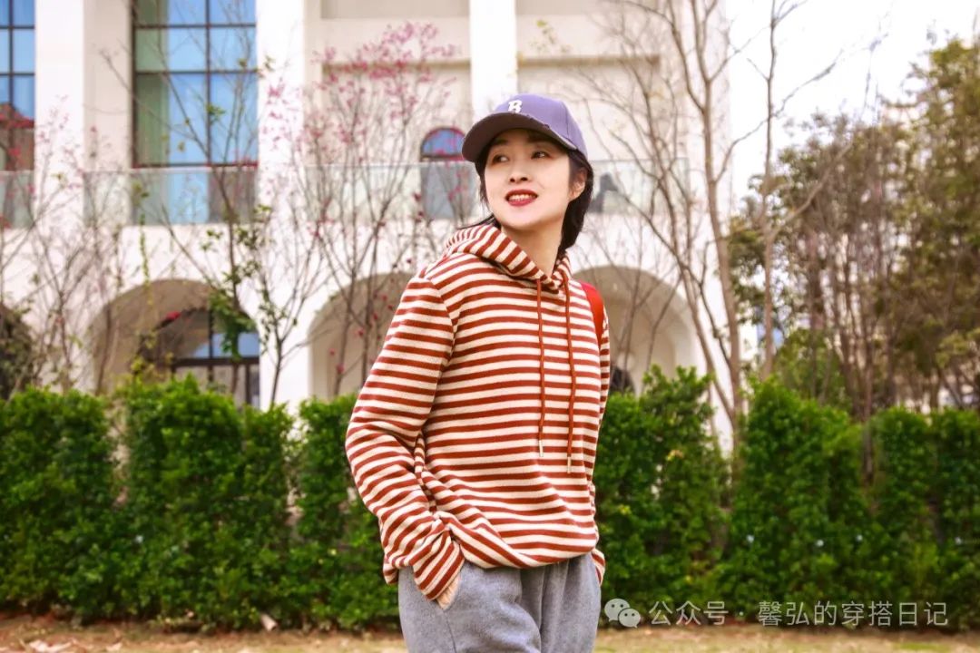 南方的早春季节,气温在20度上下,红色条纹元素的卫衣,搭配了一条运动休闲裤,假日的松弛感。