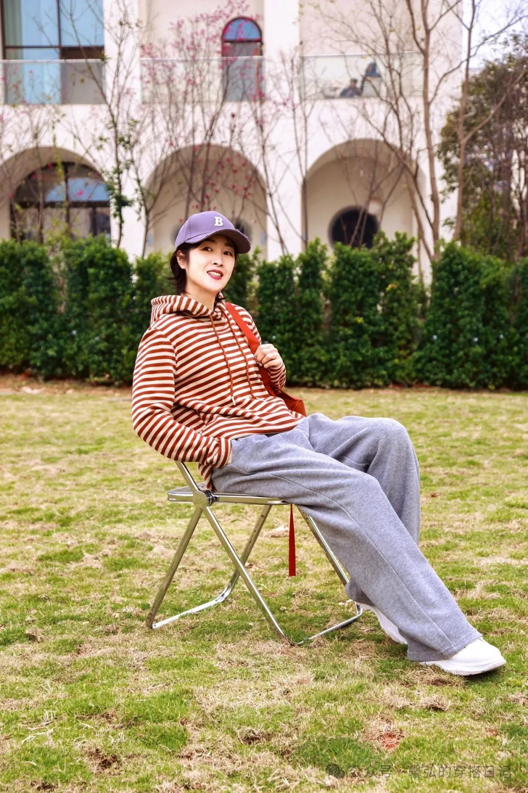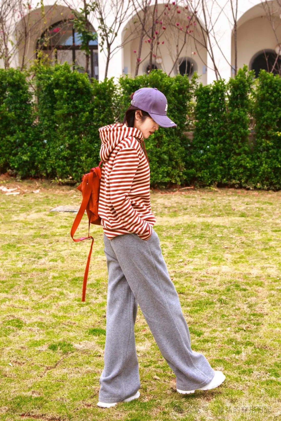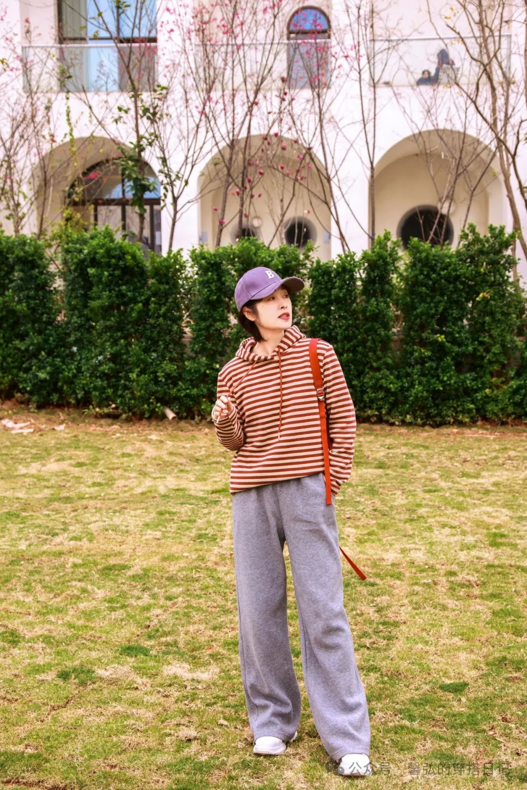 南方的早春季节,气温在20度上下,红色条纹元素的卫衣,搭配了一条运动休闲裤,假日的松弛感。