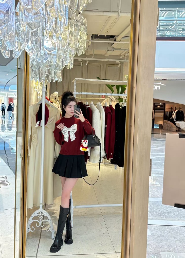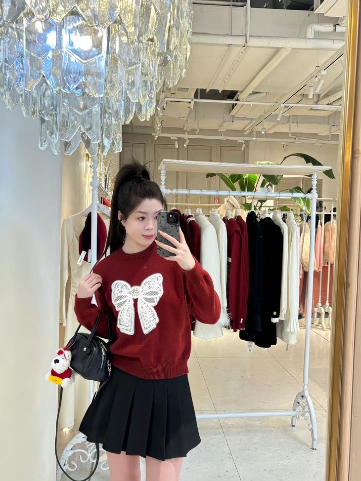 红色毛衣显白张扬又不失甜美温柔,节日氛围感瞬间拉满,绵羊毛兔毛成分,手感软糯。红色毛衣搭配牛仔裤,简洁又不失活力,是日常出街的理想选择。下半身搭配半裙,精致时髦凸显身材比例。格雷系穿搭:低饱和的灰色毛衣真的自带韩系氛围感,白色蝴蝶结自带甜美温柔感,下身搭配百褶裙/A字半裙/小腿袜修饰腿型,灰黑配色互相呼应大写的慵懒休闲学院感。