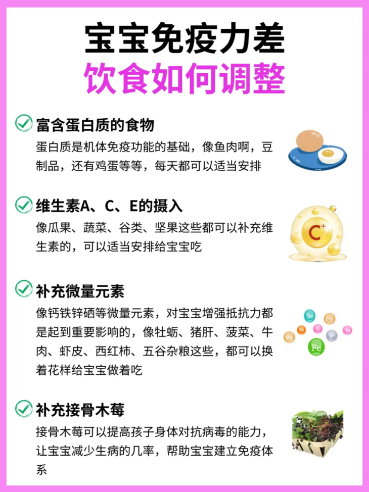 • 每次生病后,恢复的时间比其他同龄健康宝宝明显延长。例如普通感冒,其他宝宝可能一周左右就痊愈,而免疫力差的宝宝可能需要两周甚至更长时间。