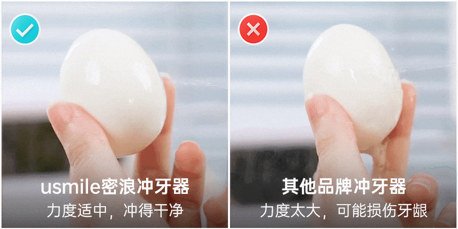 对比usmile和其他品牌,会发现冲力刚刚好👍!冲干净残渣同时不伤牙龈,娇嫩的鸡蛋毫发无损,冲得又爽又安心。