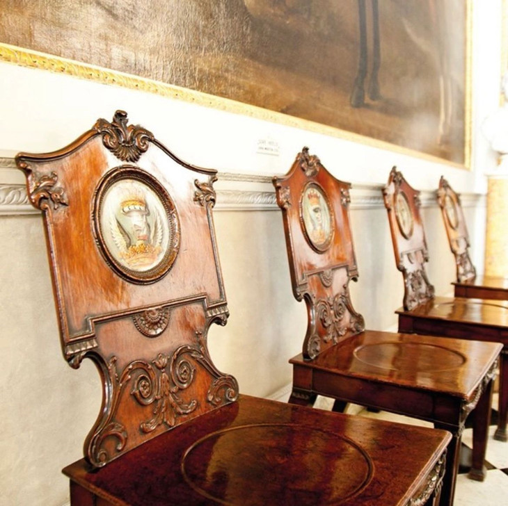 这把历史悠久的大厅休息椅、令人印象深刻的黑白格地面、故事性的大厅壁画以及大厅中央的镀金吊灯,都已成为Wooton Hall的标志。椅背上还手绘有斯宾塞家族的臂章图案,其中大厅休息椅亦得到斯宾塞勋爵授权于TA进行复刻,让喜欢它的人得以拥有。