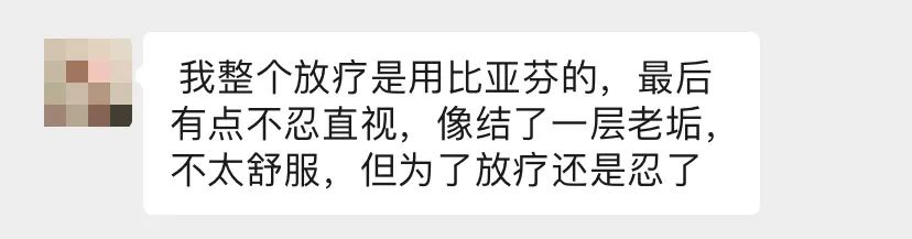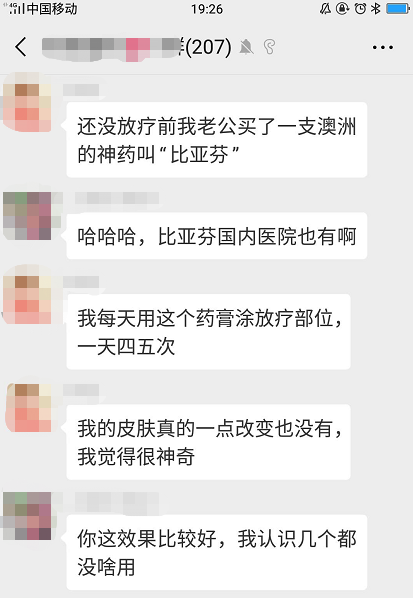 而且,在放疗期间, 放疗区域皮肤不能清洗。比亚芬是膏状,按摩吸收后,依然存在黏腻感,会吸附小毛毛和灰尘。有坚持使用了比亚芬整个放疗的姐妹反馈说: