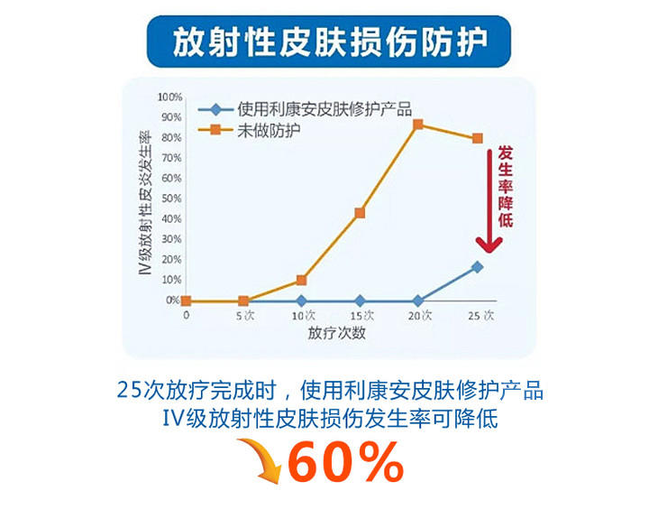 2018年3~4月,针对乳腺癌和头颈部肿瘤患者,北医三院放疗科进行了利康安皮肤修护产品预防性使用的临床实验,结果证实,本产品能够显著降低4级皮炎的发生率,25次放疗完成时,4级皮炎的发生率甚至可降低60%!