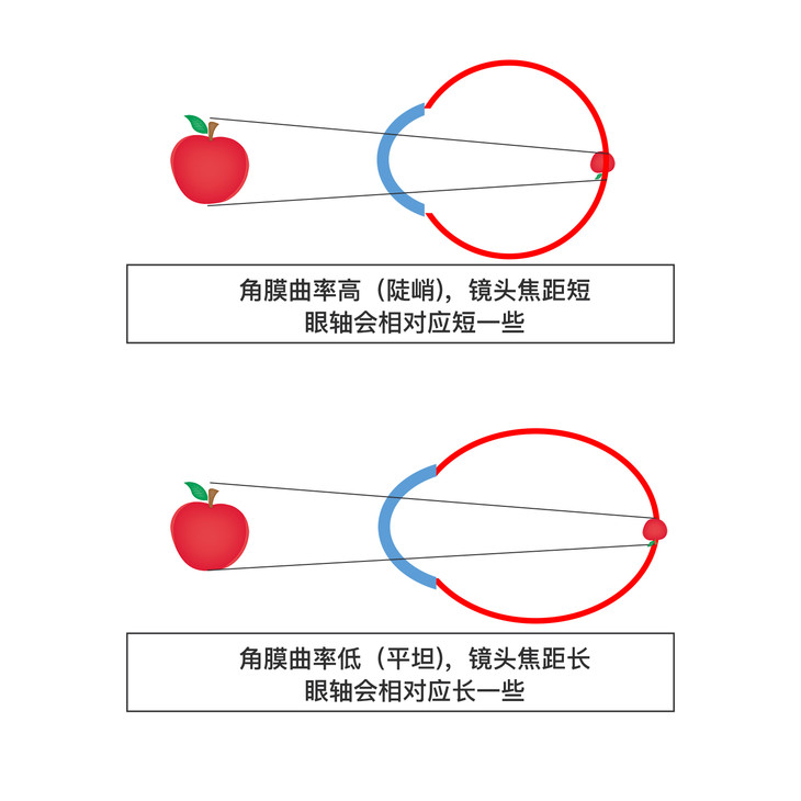 那如果反过来,孩子角膜比较平坦呢?这种孩子天生眼轴长,但也有可能最终不近视。而如果一旦近视,就属于更要积极控制眼轴的类型了。