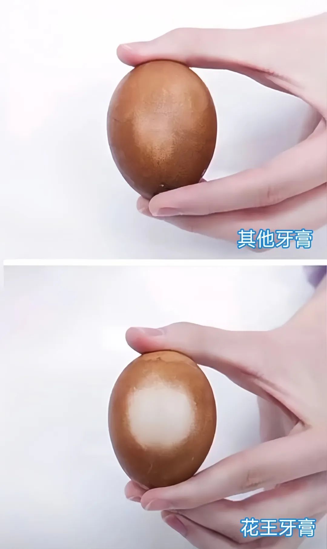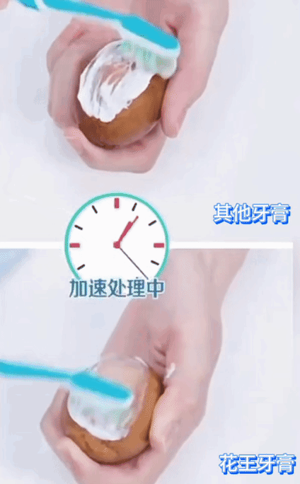 用茶叶蛋模拟牙齿表面污垢,上面用普通牙膏,下面用花王大白管,同样刷3分钟。