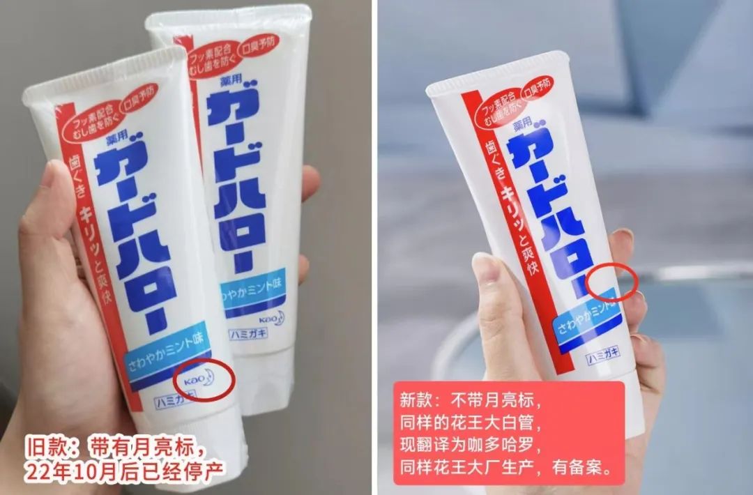 另外,给大家科普一下,之前的花王大白管,右下角带有月亮标,在22年10月之后已停产,现在市场上带月亮标,22年10月后的牙膏都是假货!