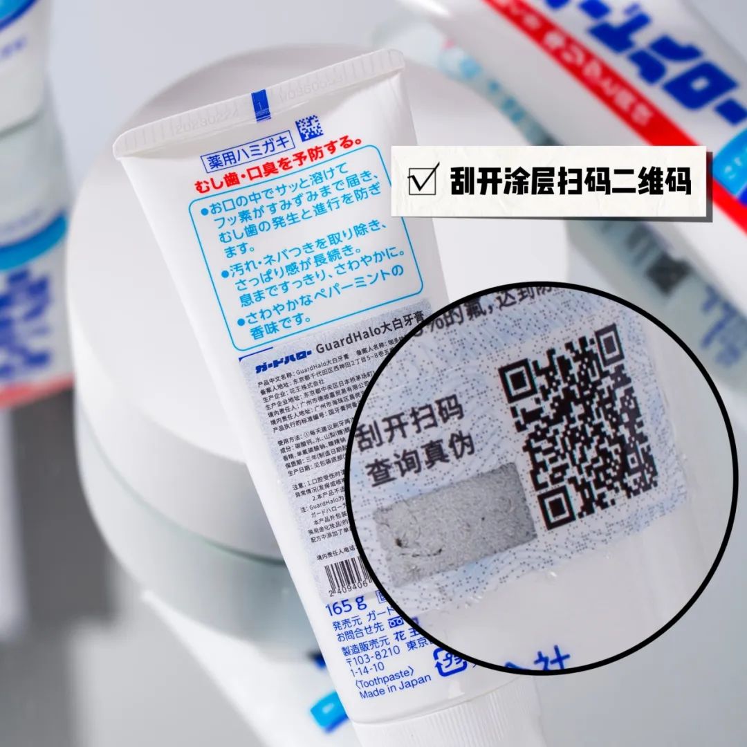 大家还可以扫描牙膏上的二维码查验真伪,刮开二维码旁的涂层,扫码后输入4位防伪码,即可查询。