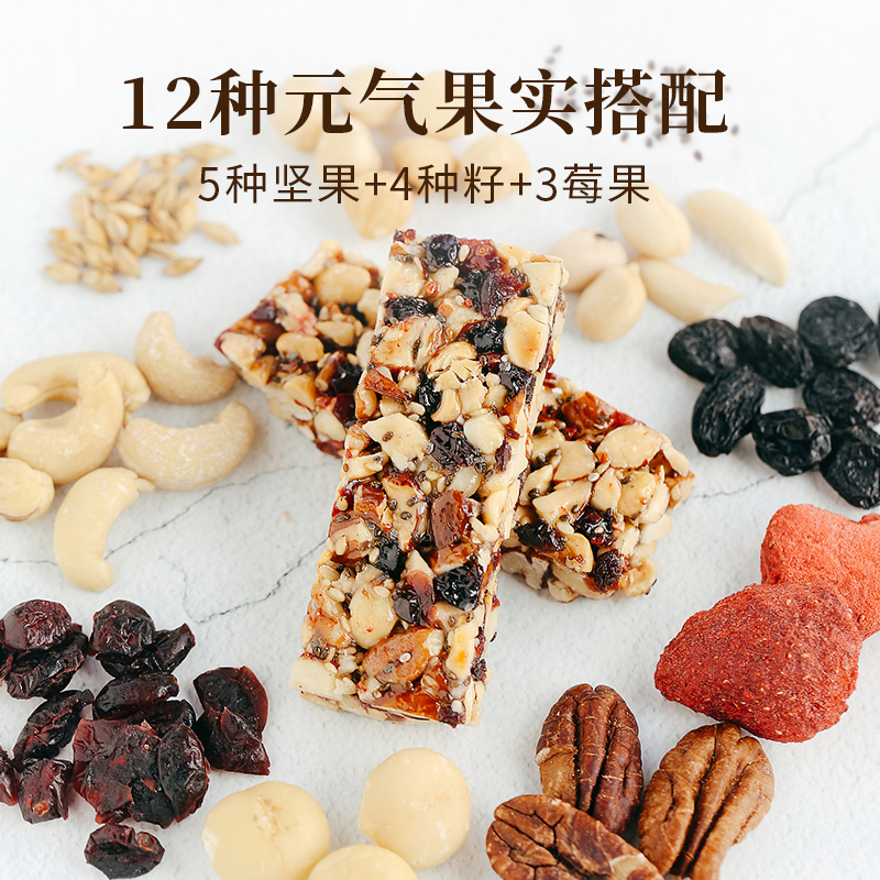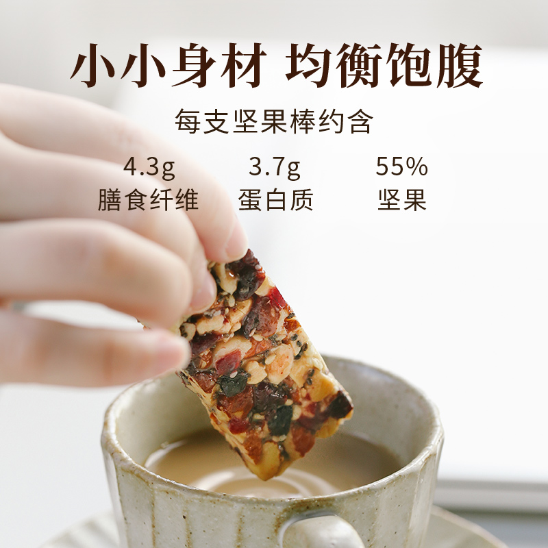 :饱腹感:每100g坚果棒含有14.3克膳食纤维,折合到每支含有4.3g膳食纤维,约等于433g水芹菜,给到充足的饱腹感,对于偶尔的小饿小困,十分适合。