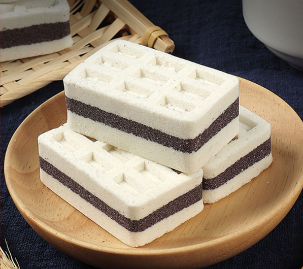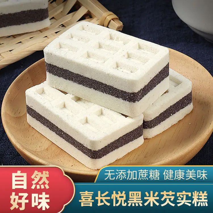 黑米芡实糕,不添加蔗糖,撕开透明的包装,一层洁白细腻的糕点,一层黑色诱人的夹心,一股淡淡的清香。