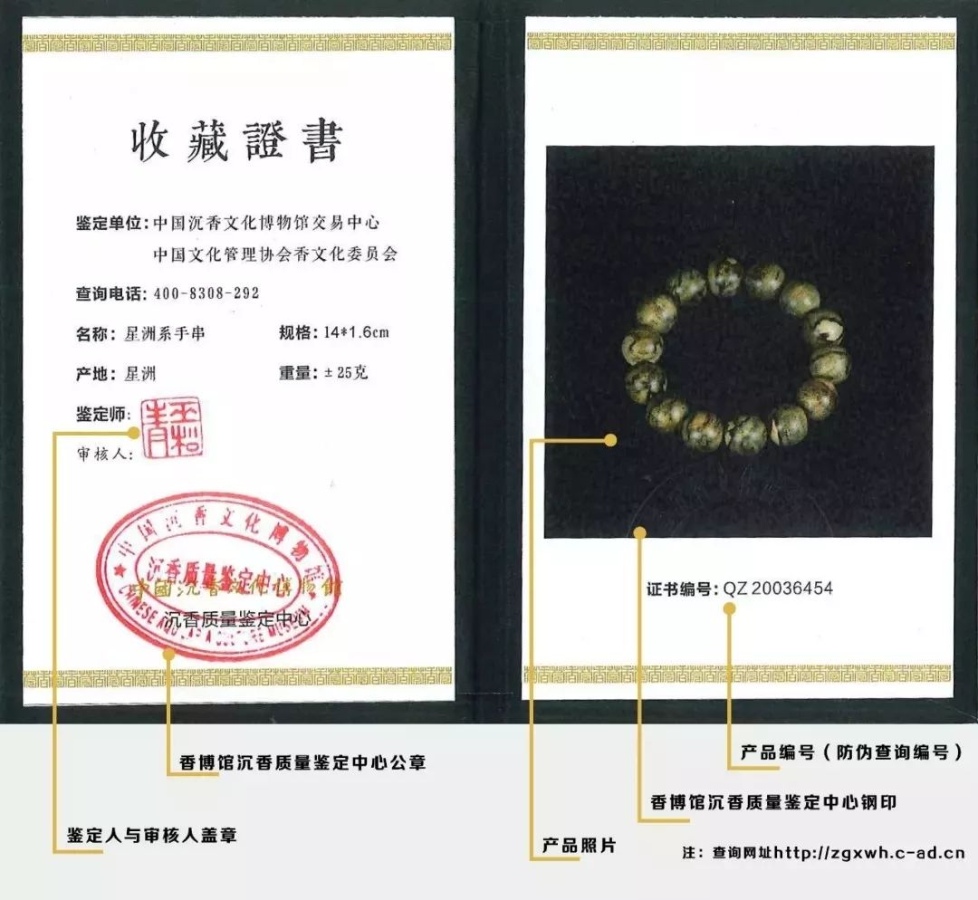 一品一证,真伪可查:香博馆交易中心藏品级别产品均配有专属鉴定收藏证书,证书均有编码和产品实拍图片,并可在中国沉香文化博物馆微信公众号服务号和网站(http://www.c-ad.cn)查询真伪,下图为证书示例,非本产品证书。