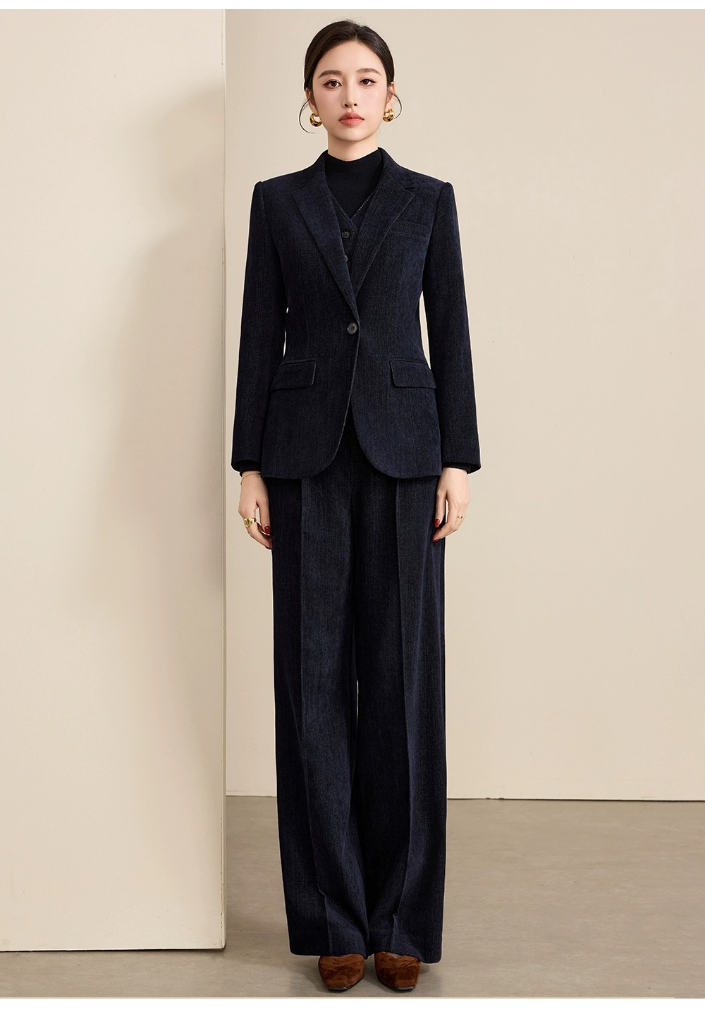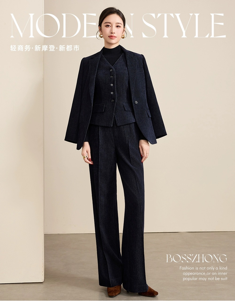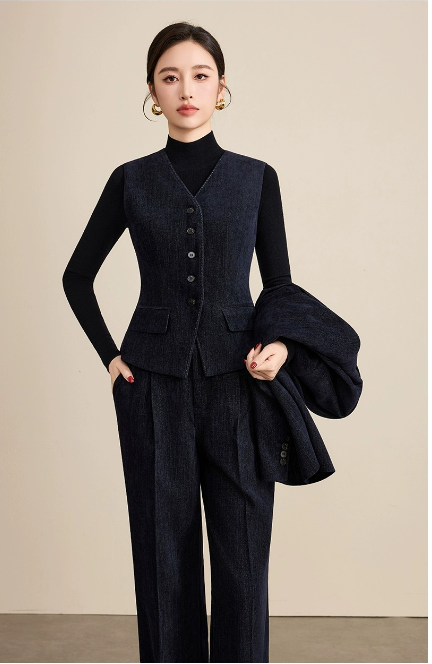 藏青是职场的「安全牌」,但牛仔肌理是不妥协的「个性注脚」——这套三件套,让你在「专业」与「自我」之间,找到最舒服的平衡点。