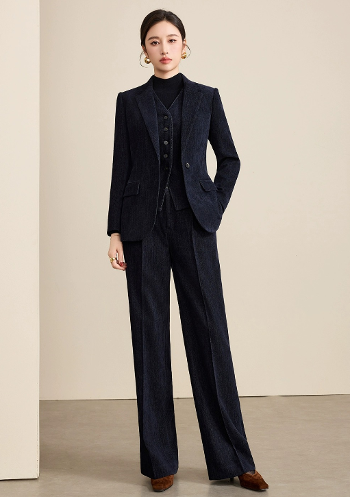 不是硬挺的牛仔布,而是融入西装面料的细腻纱线,自带雾面哑光的高级褶皱感,既有牛仔的随性松弛,又能撑得起职场的体面轮廓