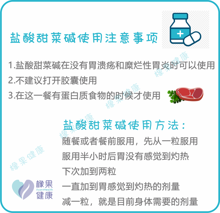 在吃含有蛋白质的食物时服用1粒盐酸甜菜碱胶囊(先吃食物再吃胶囊),如果食管、胃部没有灼烧感或不适感,吃几口食物,过5-10分钟再吃1粒,以此类推,直到肚子有温热的感觉。比如你在吃第4粒时,肚子有温热的感觉,那么你的最佳剂量是3粒。如果不适感较强,可以喝点苏打水来缓解。