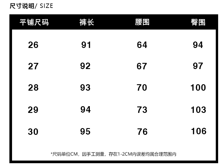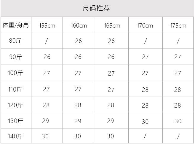 尺码表也给你们放上了,26码~30码都有,155~175的女生都能穿!