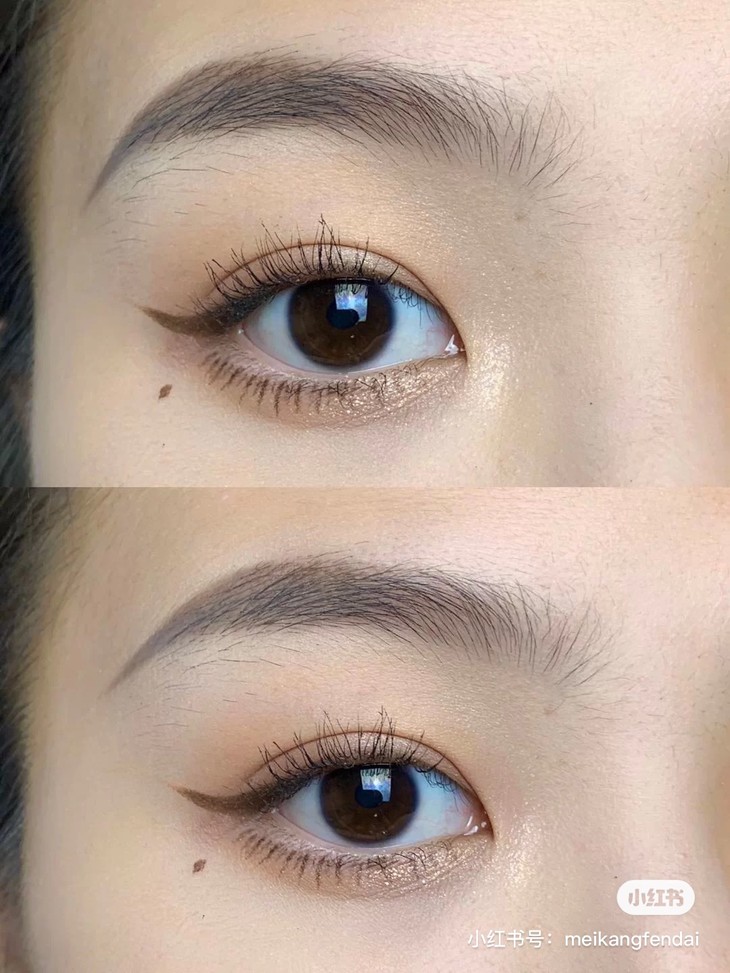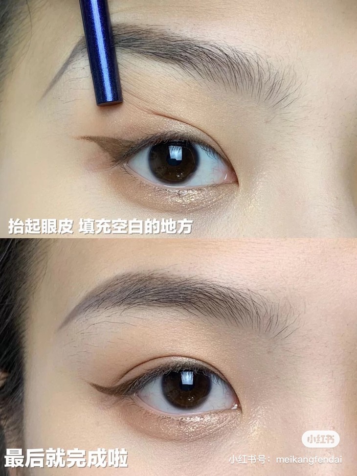 STRP 2:抬起眼皮,将空白的地方填充起来,上扬眼线就画好啦!精髓是要抬起眼皮!